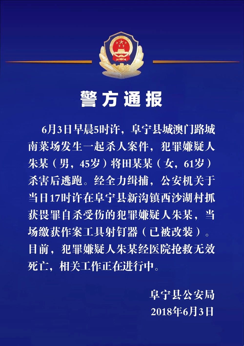 據(jù)江蘇省鹽城市阜寧縣公安局通報(bào),6月3日早晨5時(shí)許,阜寧縣城澳門路城南菜場發(fā)生一起殺人案件,犯罪嫌疑人朱某(男,45歲)將田某某(女,61歲)殺害后逃跑。經(jīng)全力緝捕,公安機(jī)關(guān)于當(dāng)日17時(shí)許在阜寧縣新溝鎮(zhèn)西沙湖村抓獲畏罪自殺受傷的犯罪嫌疑人朱某,當(dāng)場繳獲作案工具射釘器(已被改裝)。目前,犯罪嫌疑人朱某經(jīng)醫(yī)院搶救無效死亡,相關(guān)工作正在進(jìn)行中。