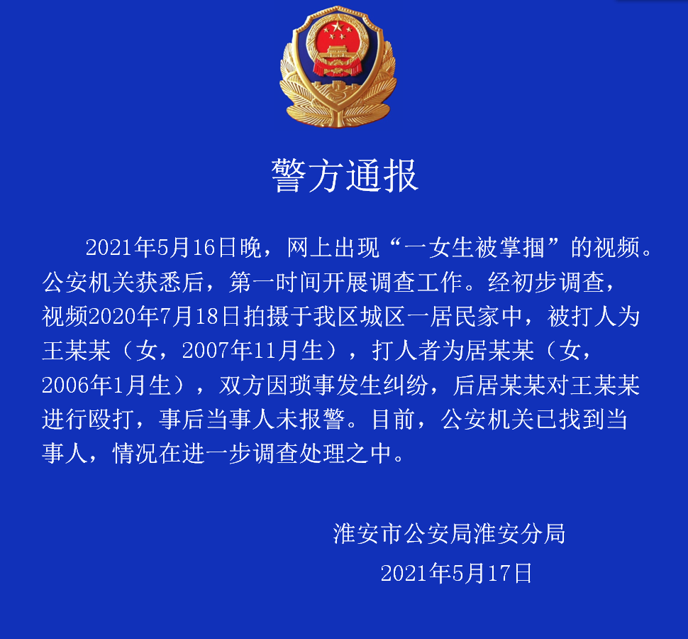 淮安警方通報(bào):事關(guān)網(wǎng)傳“一女生被掌摑”視頻