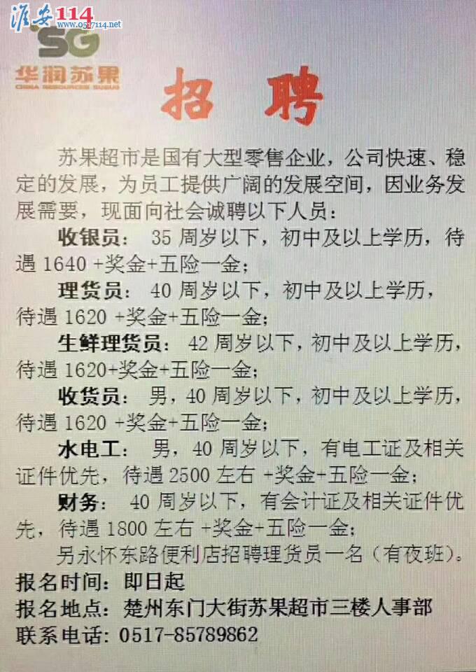 淮安區(qū)楚州永懷東路蘇果便利店現(xiàn)急招收銀員和理貨員各2名!要求:必須要能吃苦耐勞、責任心強、有上進心!有超市工作經(jīng)驗者優(yōu)先錄取!只要誠心加入蘇果大家庭的,年齡可以適當放寬,下面圖片僅作參考~~~(24小時營業(yè)有夜班)有意者請與我聯(lián)系(短期不要,要能干得長久的。幸庹哒堧娫捖(lián)系,非誠勿擾!