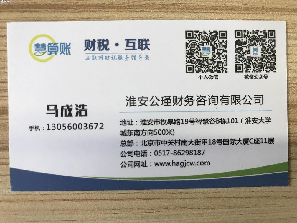 我是淮安公瑾財(cái)務(wù)代理記賬公司的馬成浩,我們公司是一家專(zhuān)業(yè)的記賬公司,主營(yíng)業(yè)務(wù)有公司注冊(cè)、代理記賬、銀行開(kāi)戶(hù)、納稅申報(bào)、月報(bào)、季報(bào)、年報(bào)、票據(jù)整理、裝訂憑證、所得稅匯算清繳、工商年檢、殘保金核定,商標(biāo)注冊(cè)。電話(huà):13056003672馬成浩(不含隱形收費(fèi)) 淮安公瑾財(cái)務(wù)咨詢(xún)有限公司
