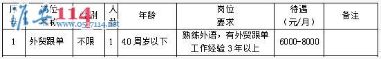 招聘外貿跟單員1名,性別不限,年齡40周歲以下,熟練外語,有外貿跟單工作經(jīng)驗3年以上,月薪6K以上。