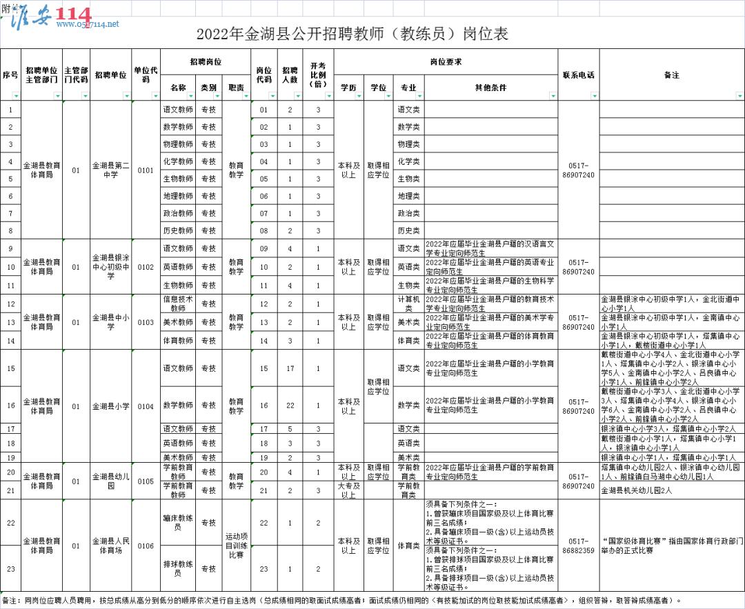 招聘單位、崗位、人數(shù)和相關(guān)要求詳見《2022年金湖縣公開招聘教師(教練員)崗位表》(以下簡(jiǎn)稱《崗位表》)。