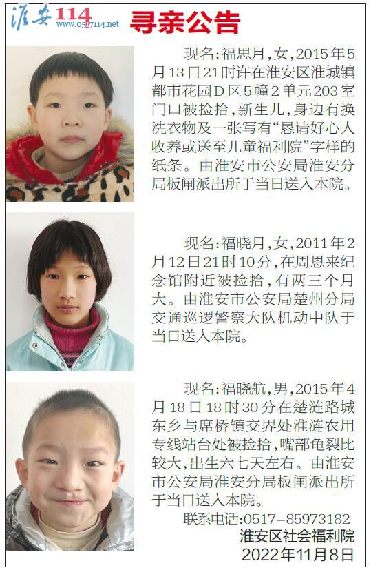 淮安區(qū)社會福利院尋親公告(11月8日)