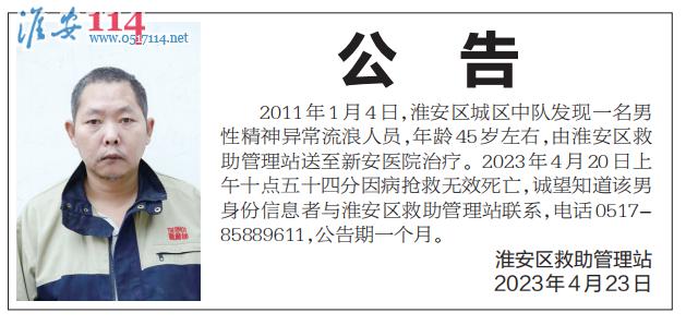 2011年1月4日,淮安區(qū)城區(qū)中隊發(fā)現一名男性精神異常流浪人員,年齡45歲左右,由淮安區(qū)救助管理站送至新安醫(yī)院治療。2023年4月20日上午十點五十四分因病搶救無效死亡,誠望知道該男身份信息者與淮安區(qū)救助管理站聯系,電話0517-85889611,公告期一個月。