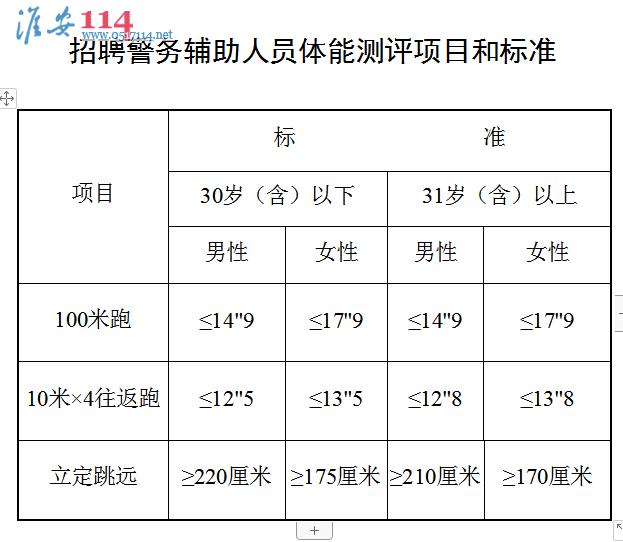 考生筆試、面試綜合成績從高分到低分順序,按崗位招聘人數1:1.4的比例進入體能測試環(huán)節(jié)。體側總分100分,占總成績10%。體能測試項目為100米跑、10米×4往返跑、立定跳遠。體能測試時間和地點另行通知(體能測試合格標準參照附件3)。